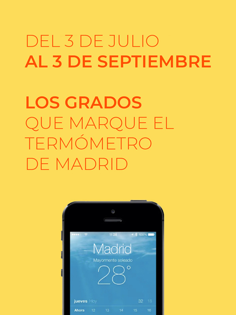 The maximum temperature (in degrees Celsius) in Madrid is automatically updated at 00:01 in Madrid CEST time zone and is determined by Open-Meteo, an application integrated in Woocommerce that allows instant calculation. For logistical reasons, screenshots from other weather apps or websites with different temperatures, either higher or lower, will not be accepted.
