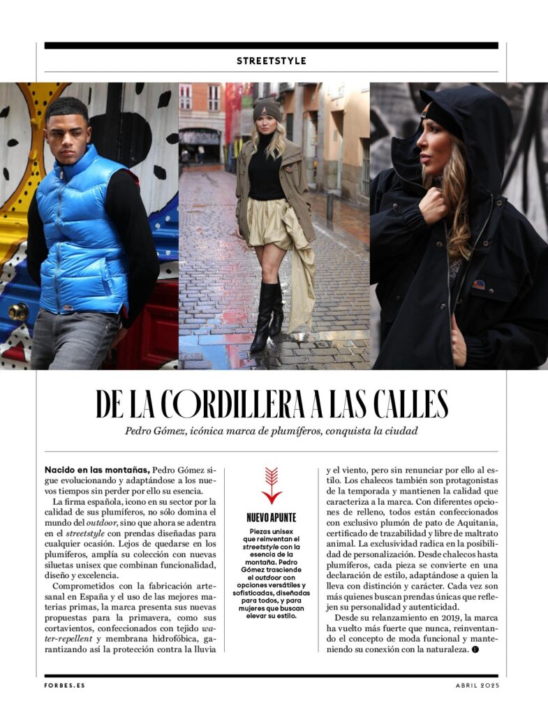 Página en la edición impresa en Forbes sobre la aspiración street-style de Pedro Gómez con la nueva colección de cortavientos, chalecos y punto publicado en abril de 2025.