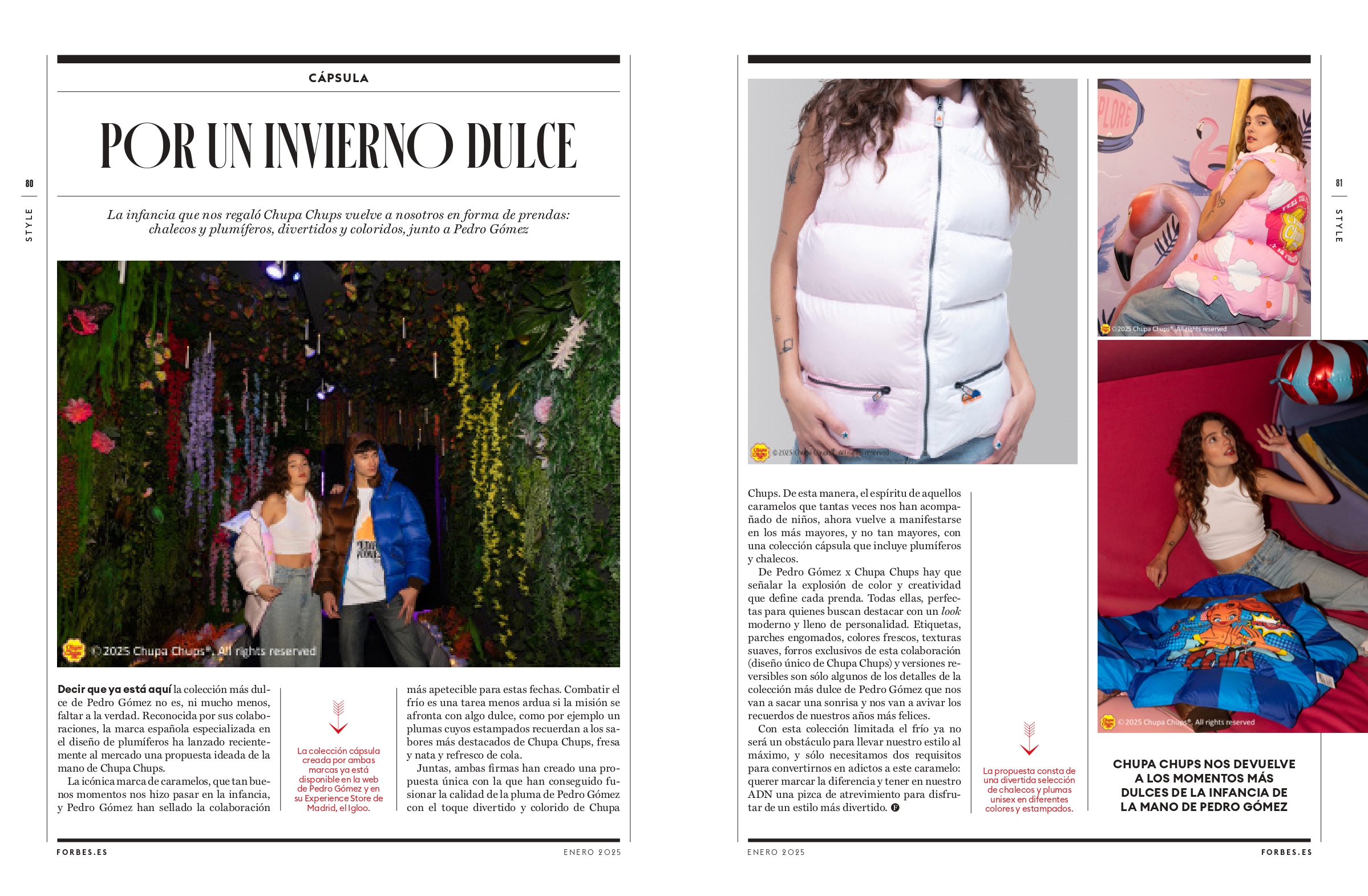 Página doble en la edición impresa en Forbes sobre la colaboración Pedro Gómez x Chupa Chups publicado en enero de 2025.