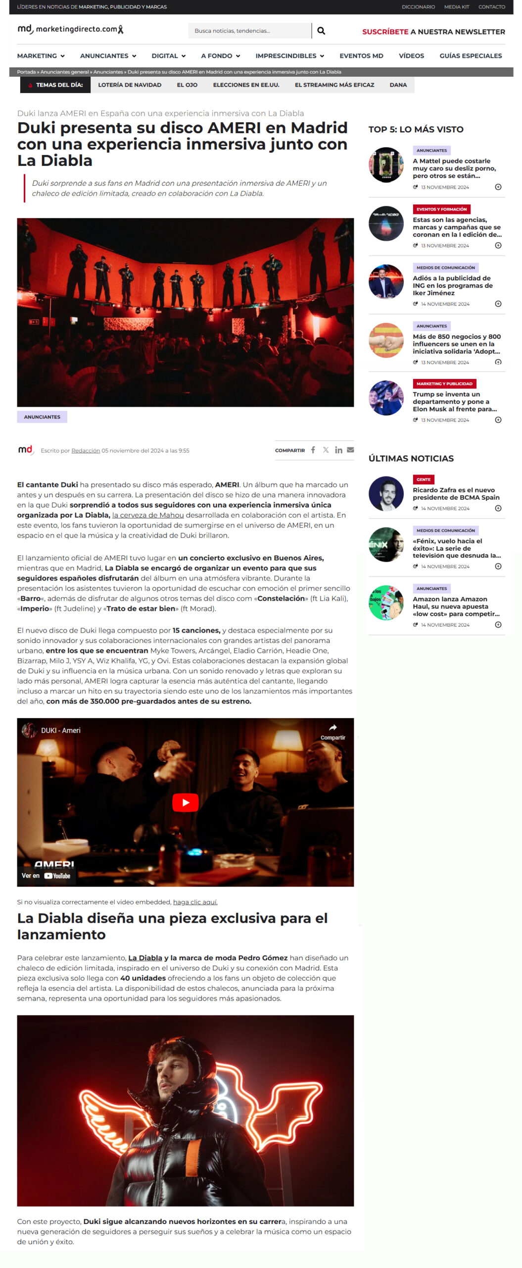 Post en la página web de Marketing Directo sobre el evento de Duki y La Diabla con Chaleco especial de Pedro Gómez Madrid publicado el 05 de noviembre de 2024