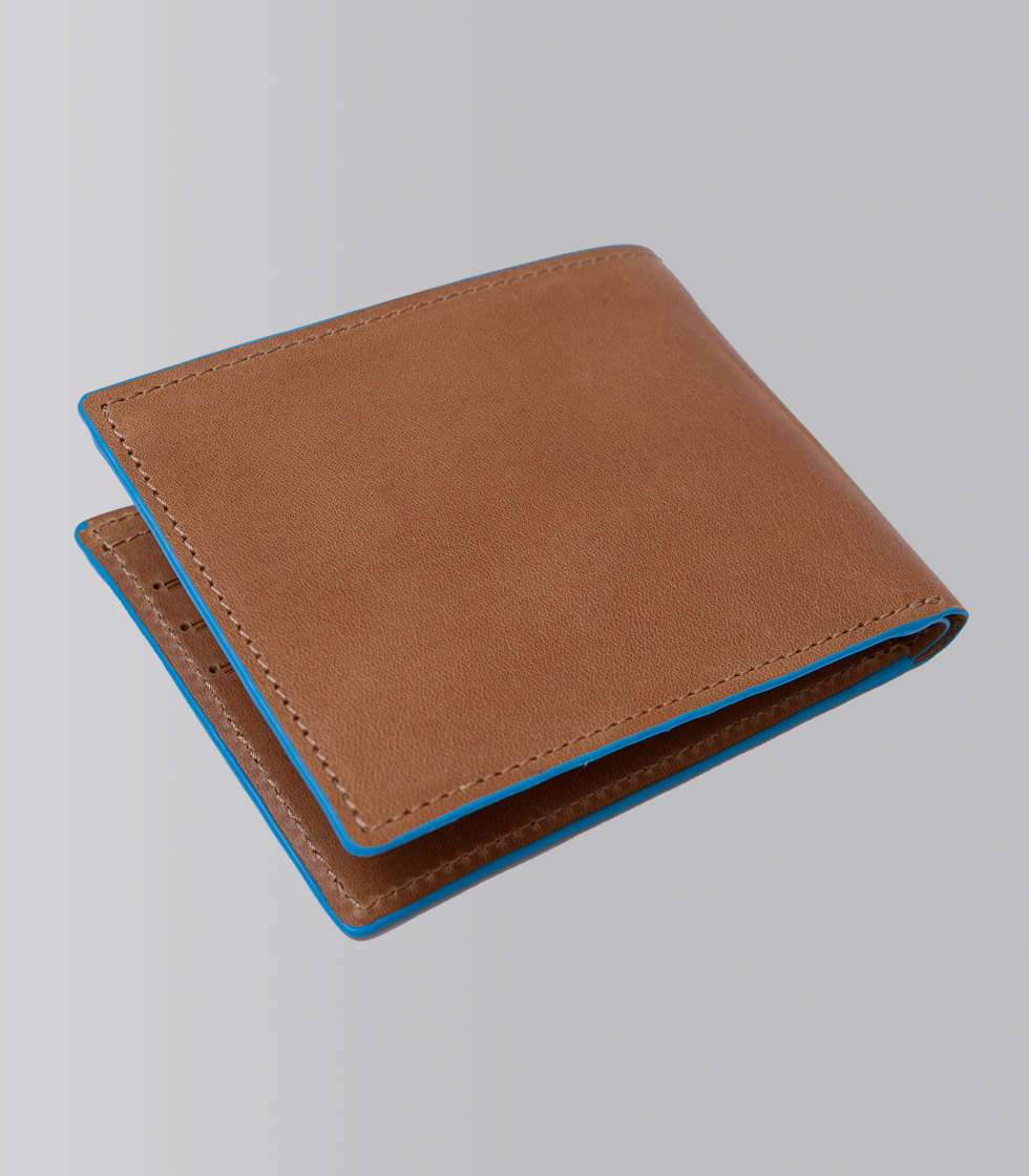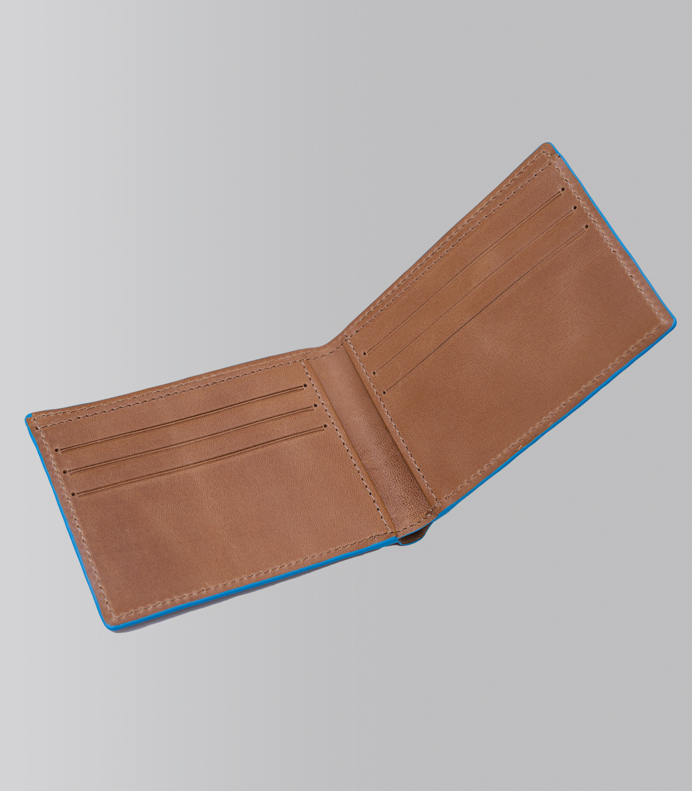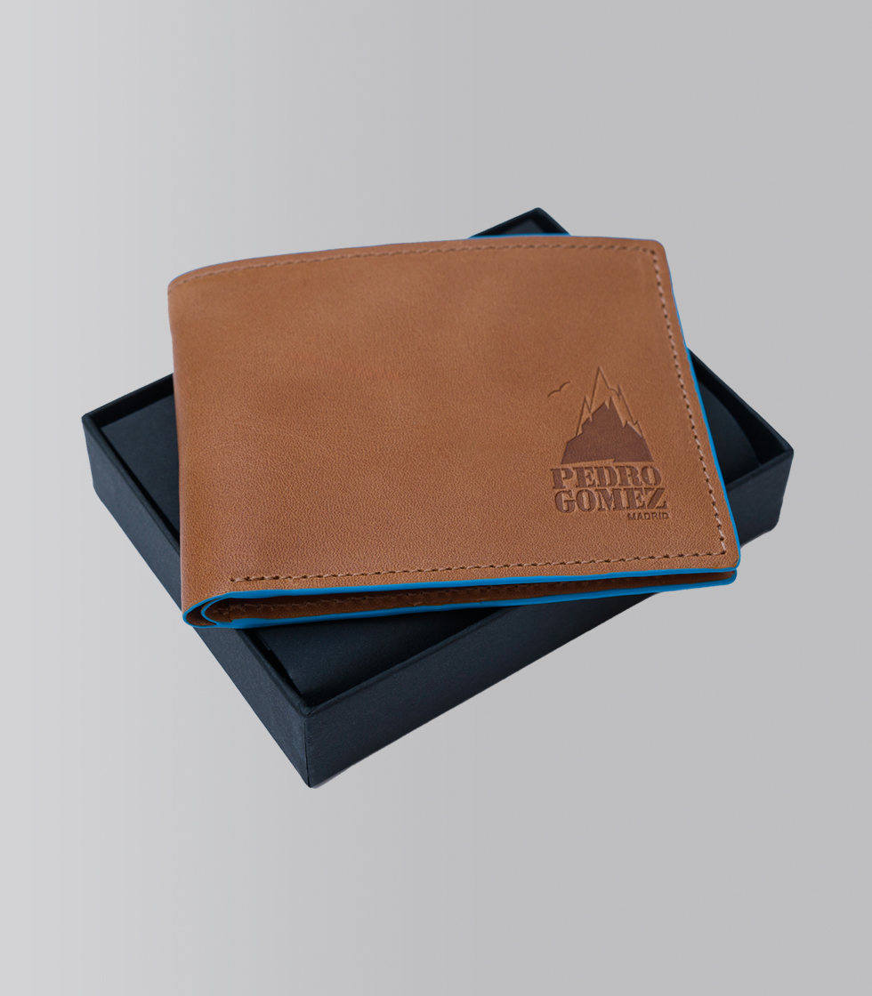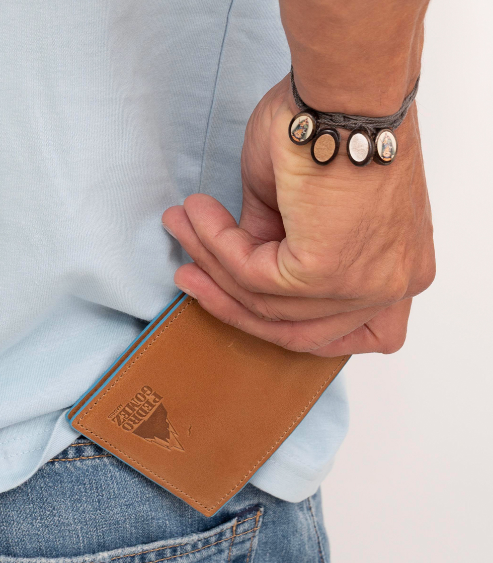 Billetero americano confeccionado en piel Arizona española, con elegantes detalles en turquesa en los cantos lujados y el logo Pedro Gómez grabado en el frontal.