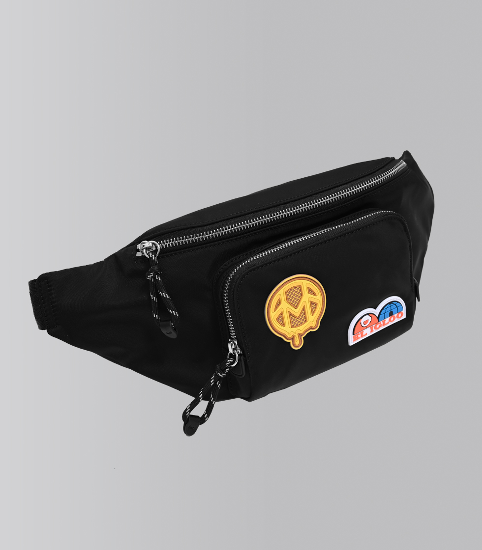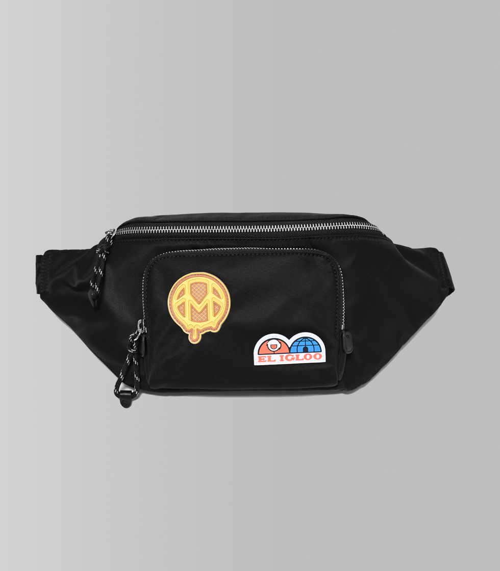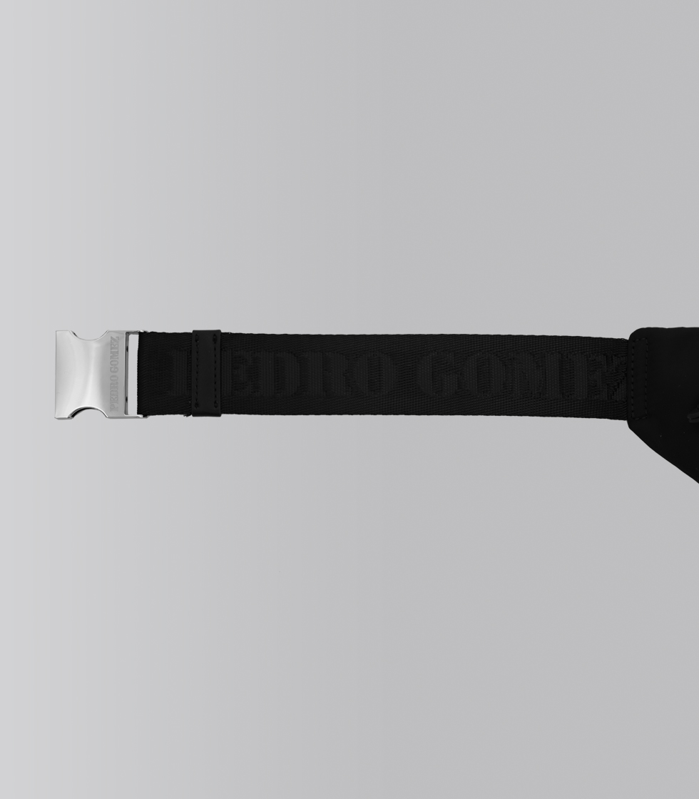 Riñonera boombag en color negro con parche engomado El Igloo y Honey Money, hebilla con logo grabado a láser y cinta personalizada con las letras de Pedro Gomez estampadas.