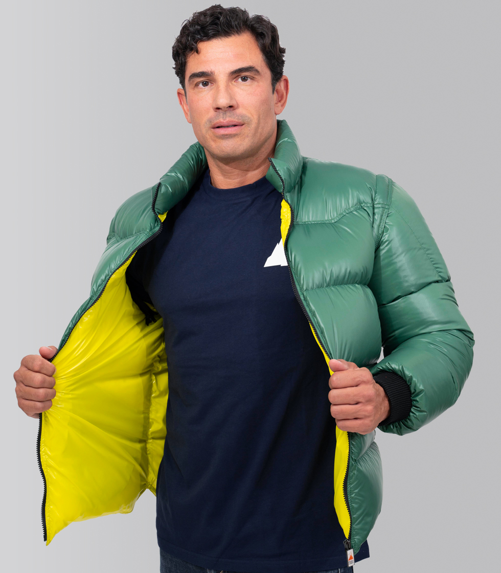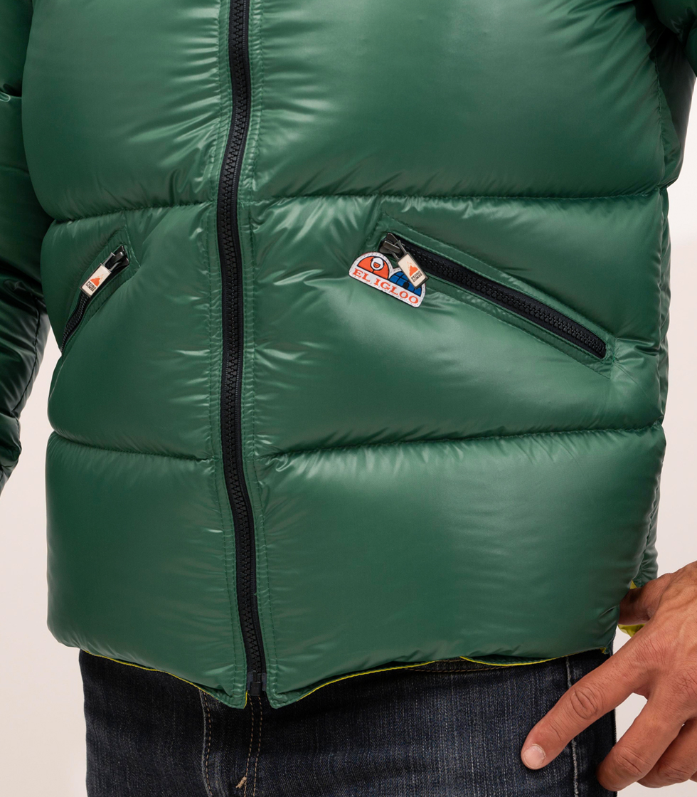 Cuerpo y canesú con el tejido retro Pedro en color verde oscuro y forro interior con el tejido Kiss en color amarillo verde lima Cedrat.
