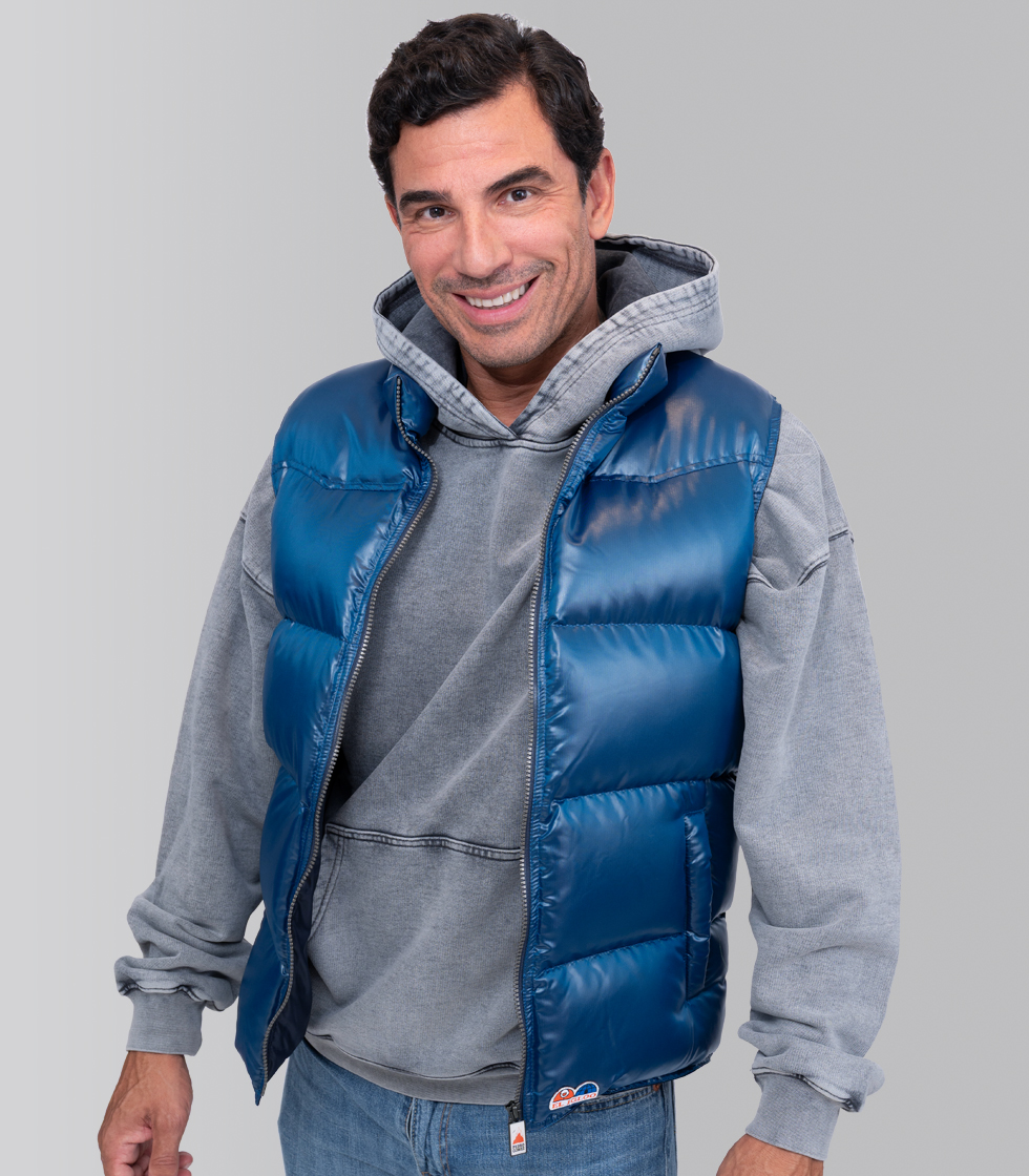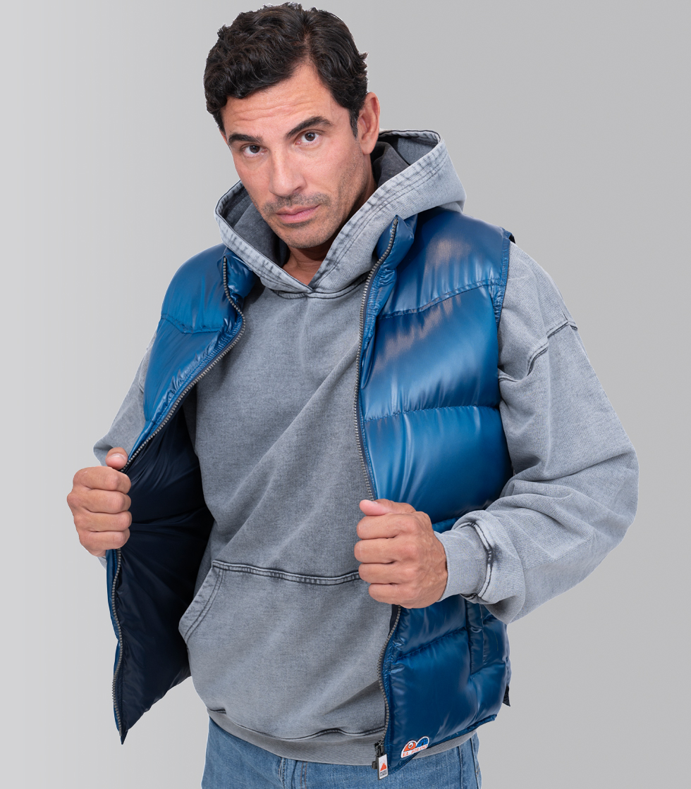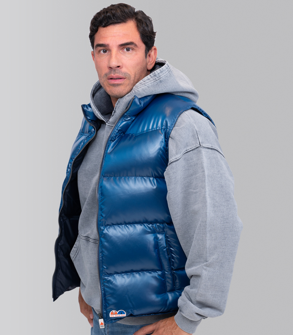 Cuerpo y canesú en tejido Carrara con el color azul Pedro Blue y forro interior en tejido Kiss con el color azul oscuro Dark Night.