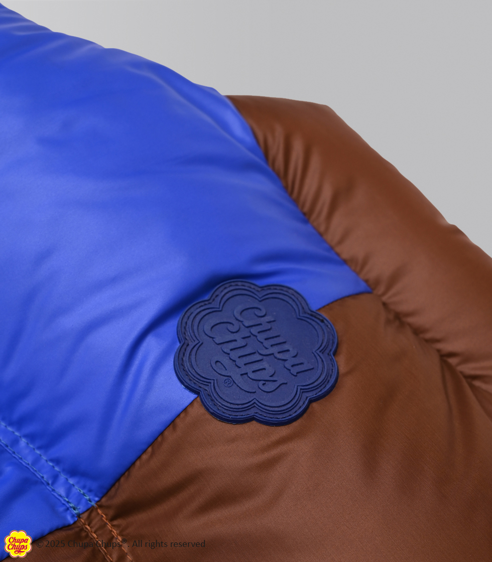 Cuerpo y canesú en tejido Kiss con los colores Azul Majorelle y Marrón Moka y forro interior en tejido Kiss con estampación especial con diseño de Chupa Chups.