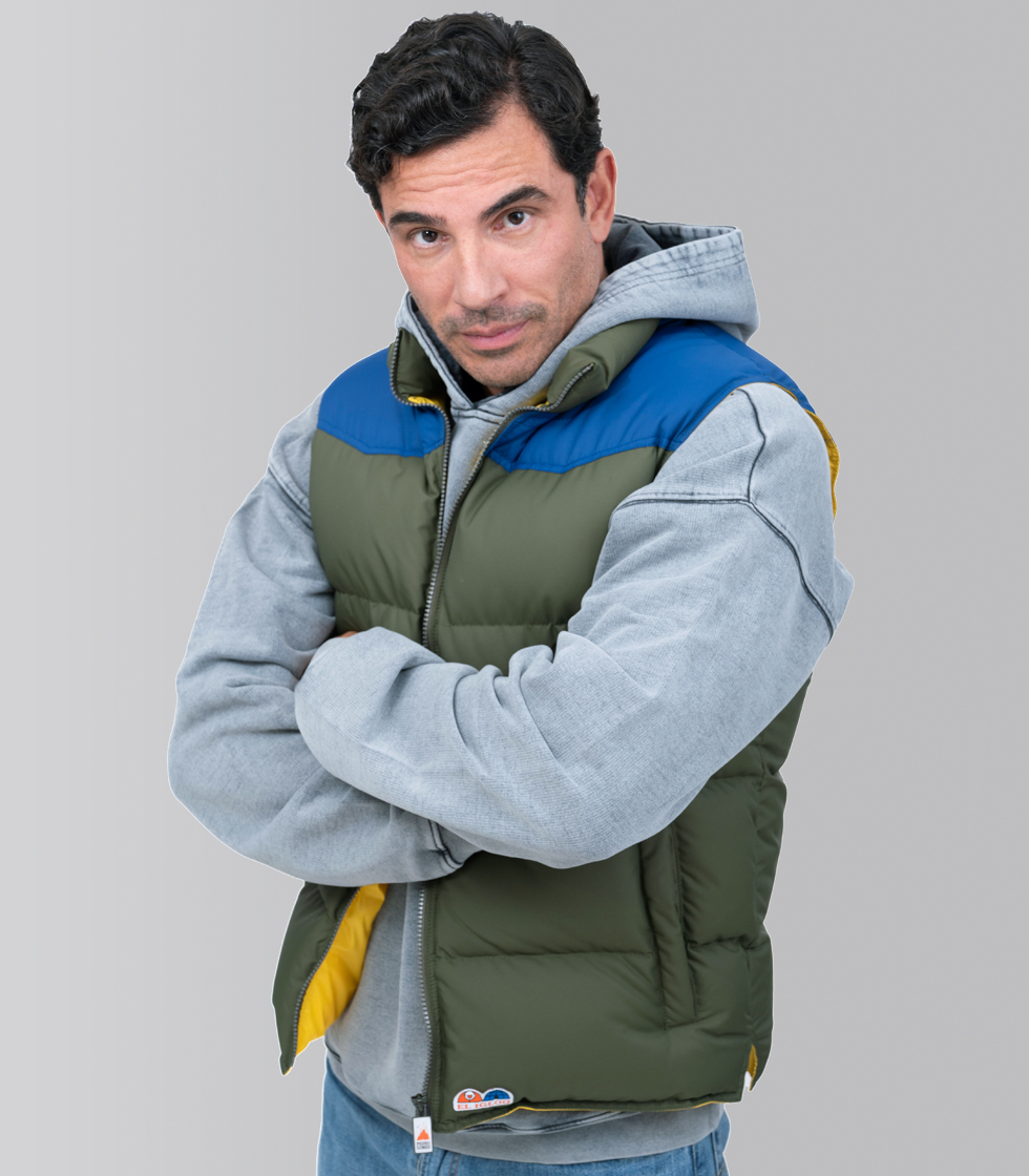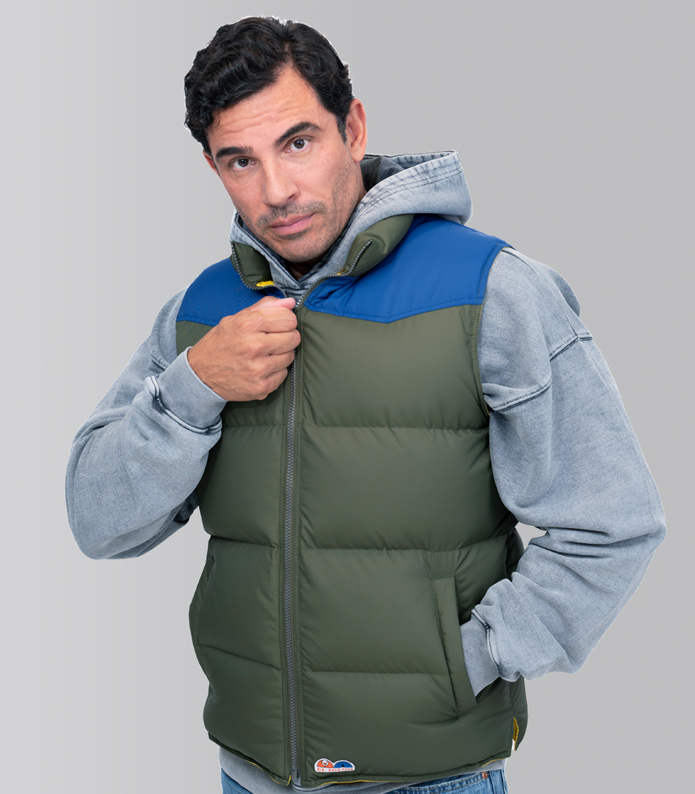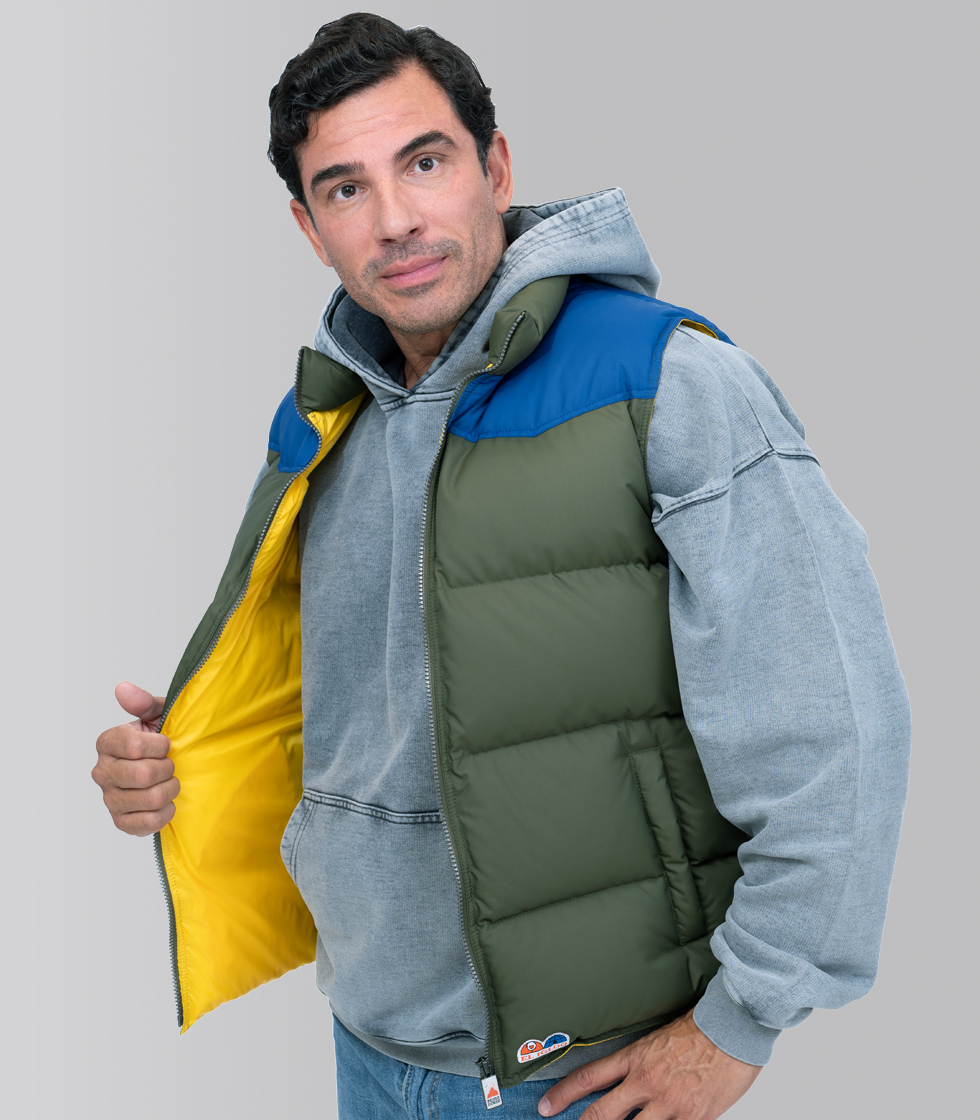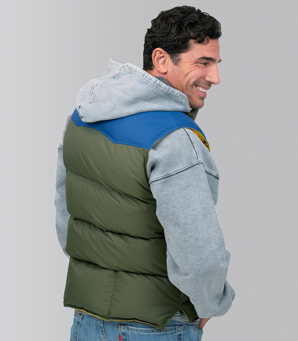 Cuerpo en tejido Lodge con el color verde army, canesú en tejido Lodge con el color azul y forro interior en tejido Kiss en el color amarillo Sunflower.