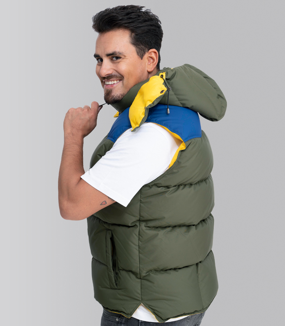 Cuerpo en tejido Lodge con el color verde army, canesú en tejido Lodge con el color azul y forro interior en tejido Kiss en el color amarillo Sunflower.