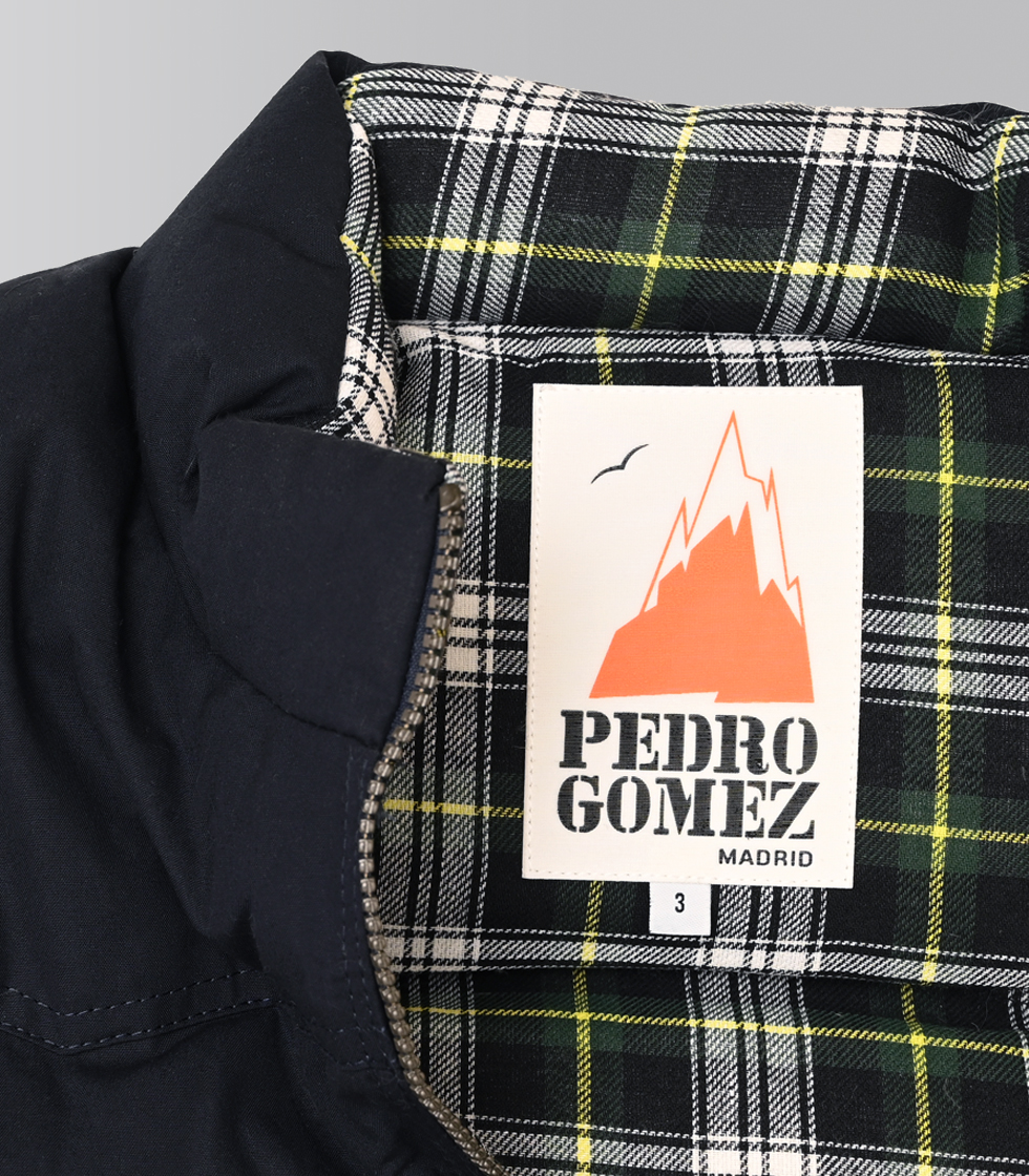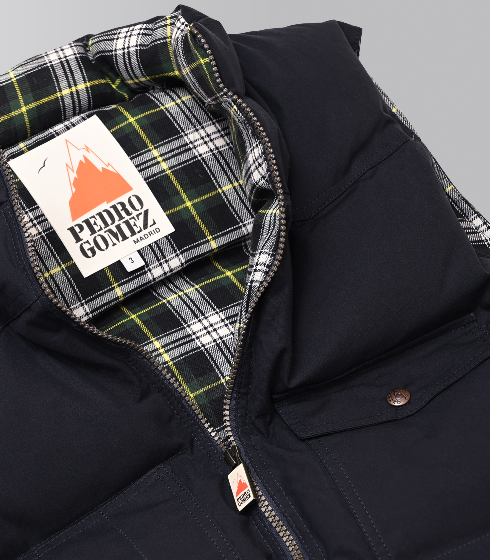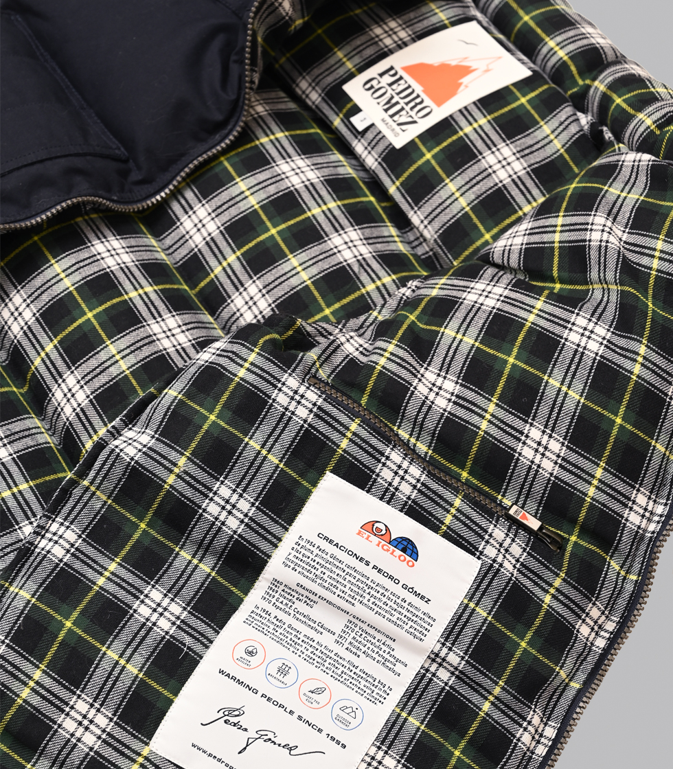 Cuerpo y canesú en tejido encerado con color navy (azul oscuro) y forro interior en tejido de algodón con el tartán en tonos azulados y verdes.