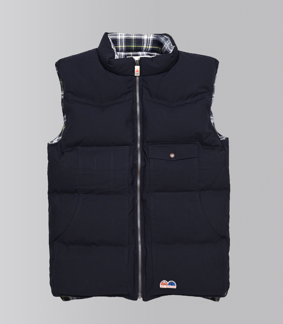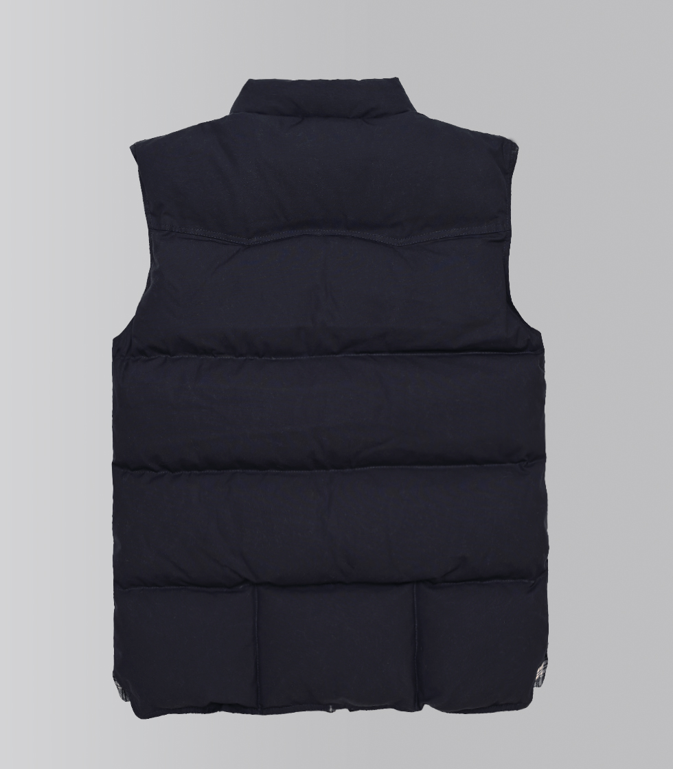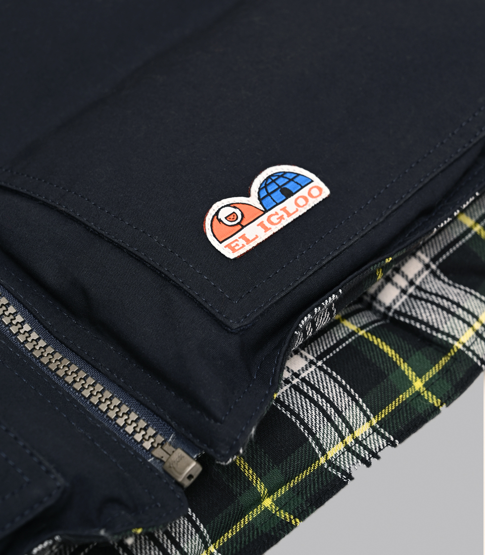 Cuerpo y canesú en tejido encerado con color navy (azul oscuro) y forro interior en tejido de algodón con el tartán en tonos azulados y verdes.