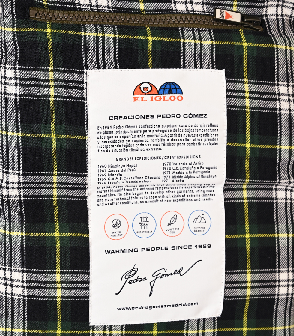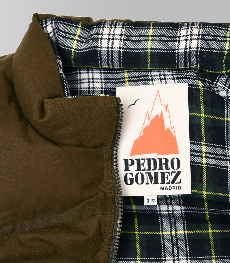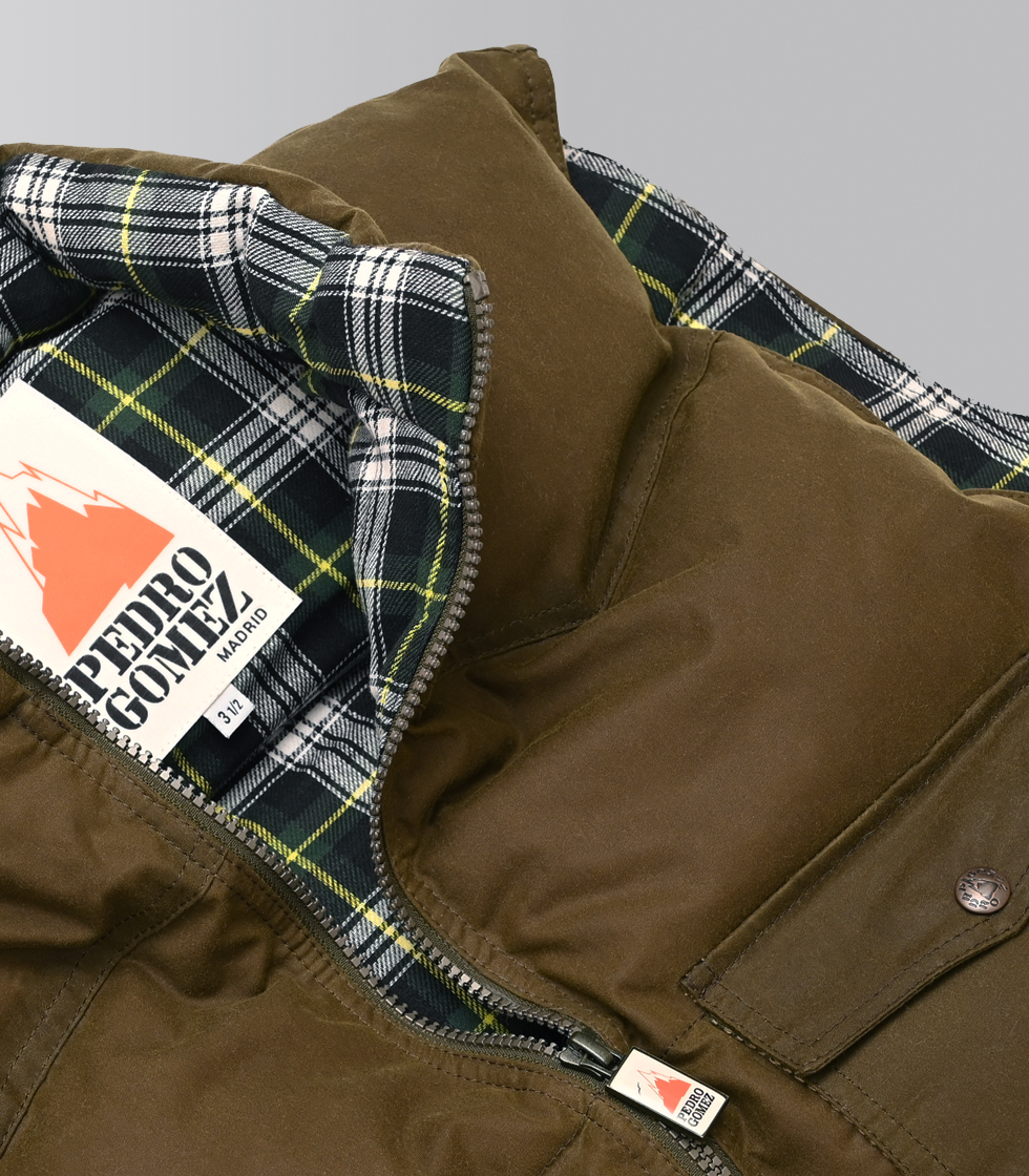 Cuerpo y canesú en tejido encerado con color verde oscuro y forro interior en tejido de algodón con el tartán en tonos azulados y verdes.