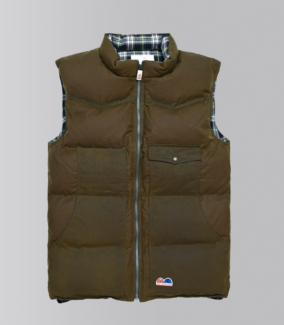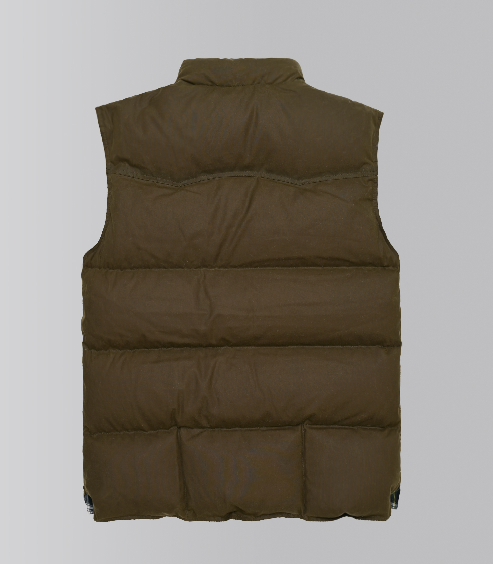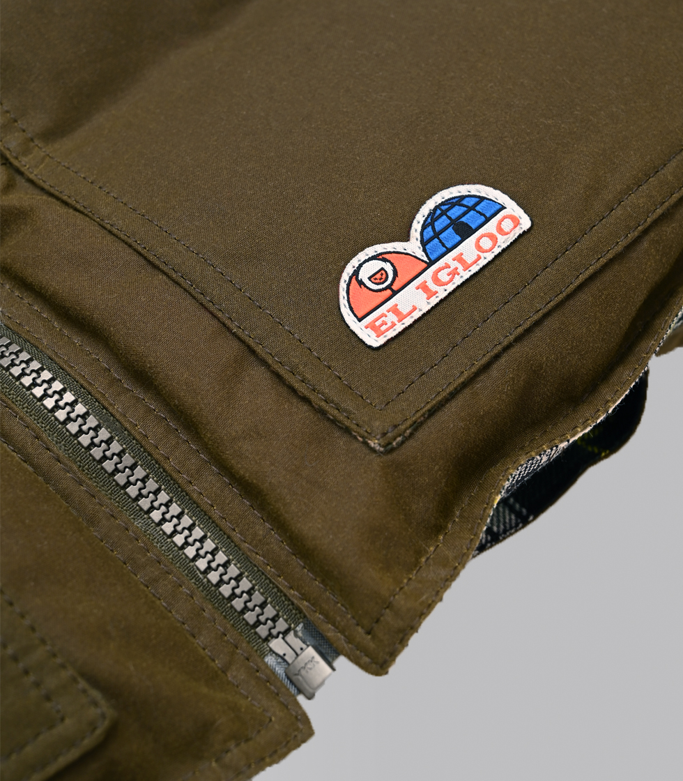 Cuerpo y canesú en tejido encerado con color verde oscuro y forro interior en tejido de algodón con el tartán en tonos azulados y verdes.